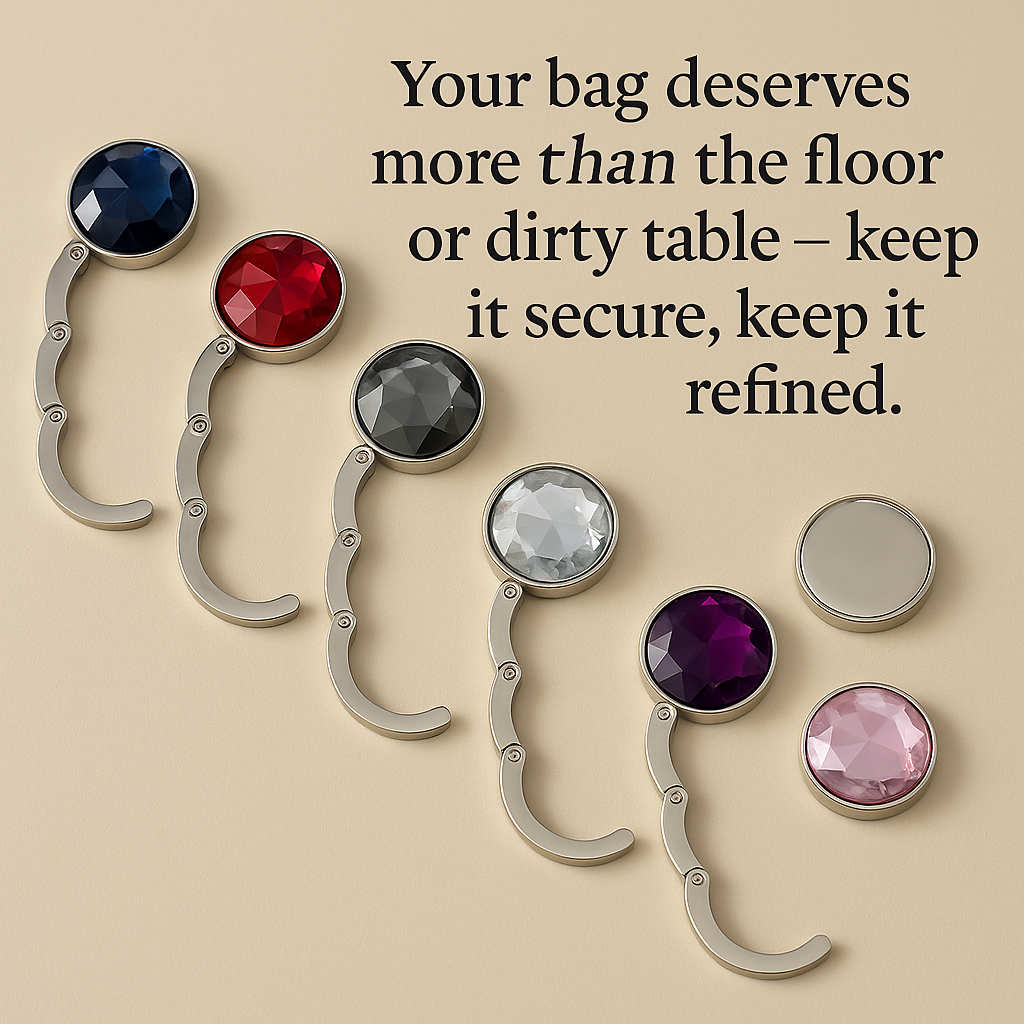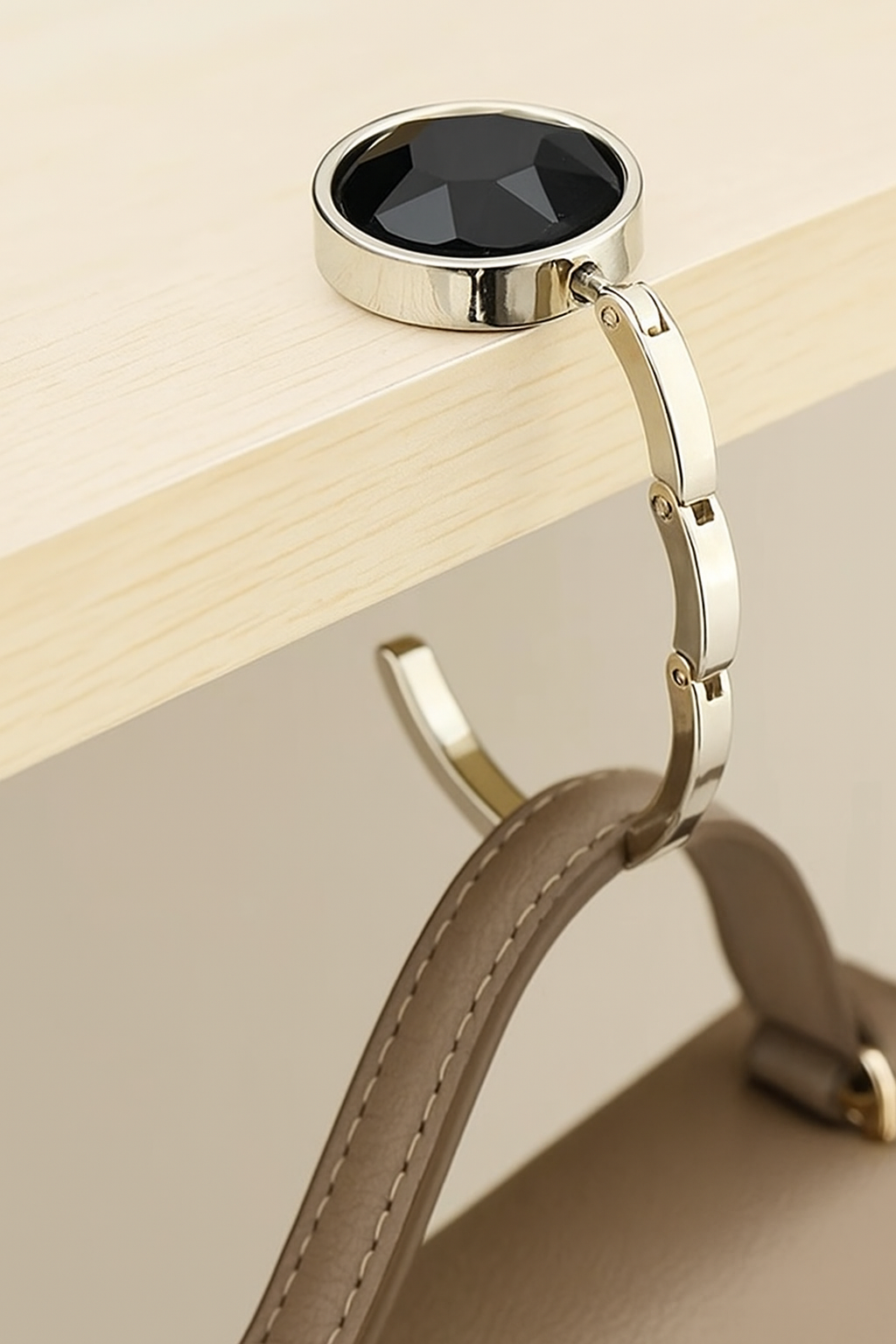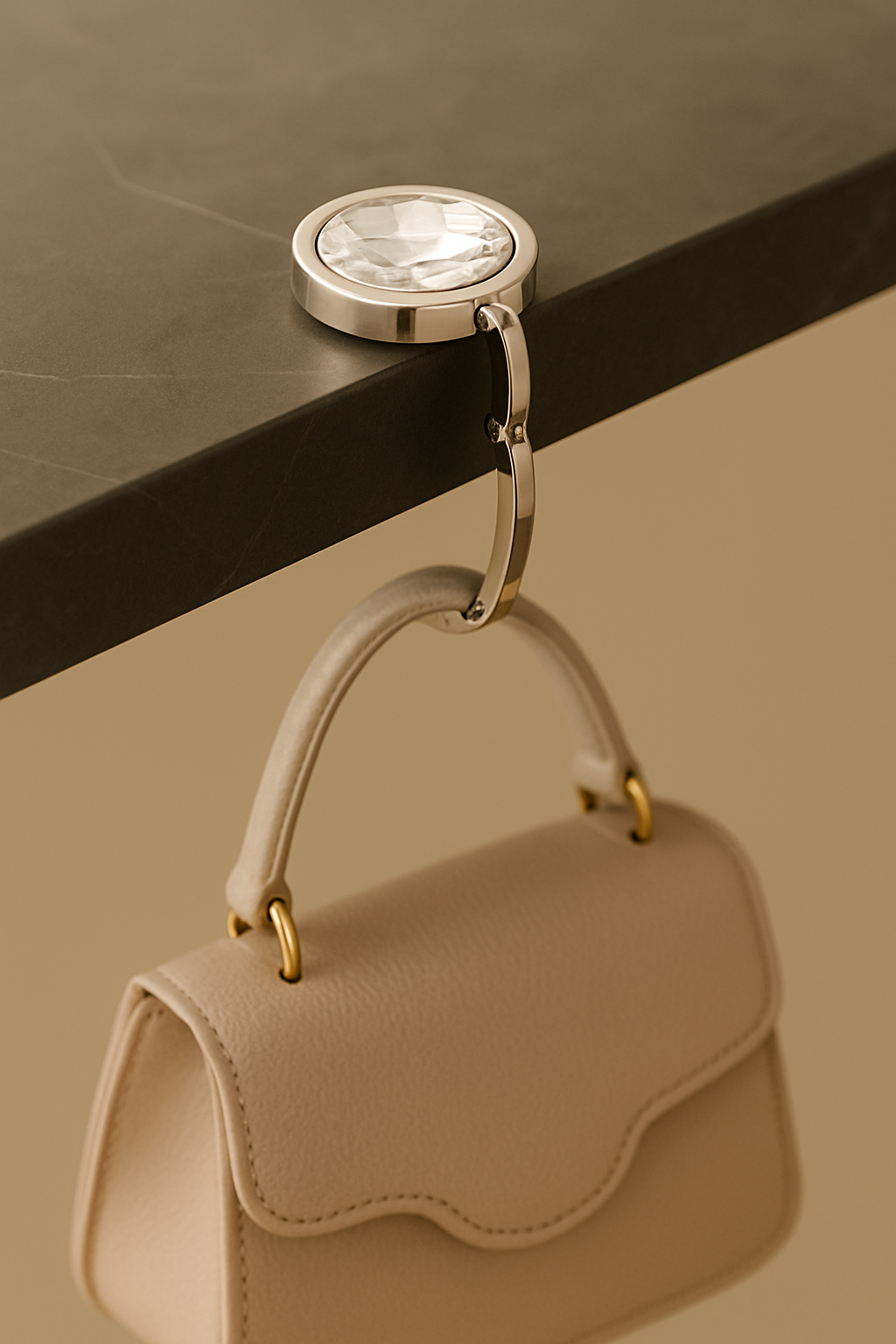 Our foldable handbag hook is compact yet strong, designed to secure your bag on any table edge. The non-slip base guarantees stability, while the rhinestone detail elevates it into more than a tool — it’s a statement.