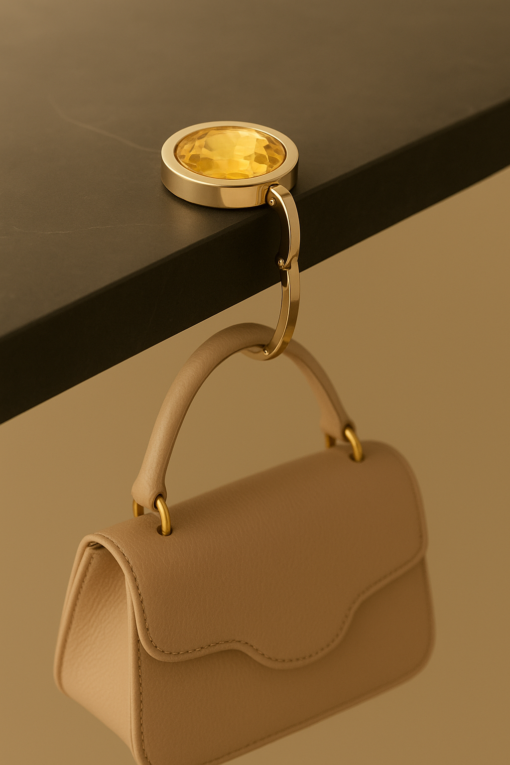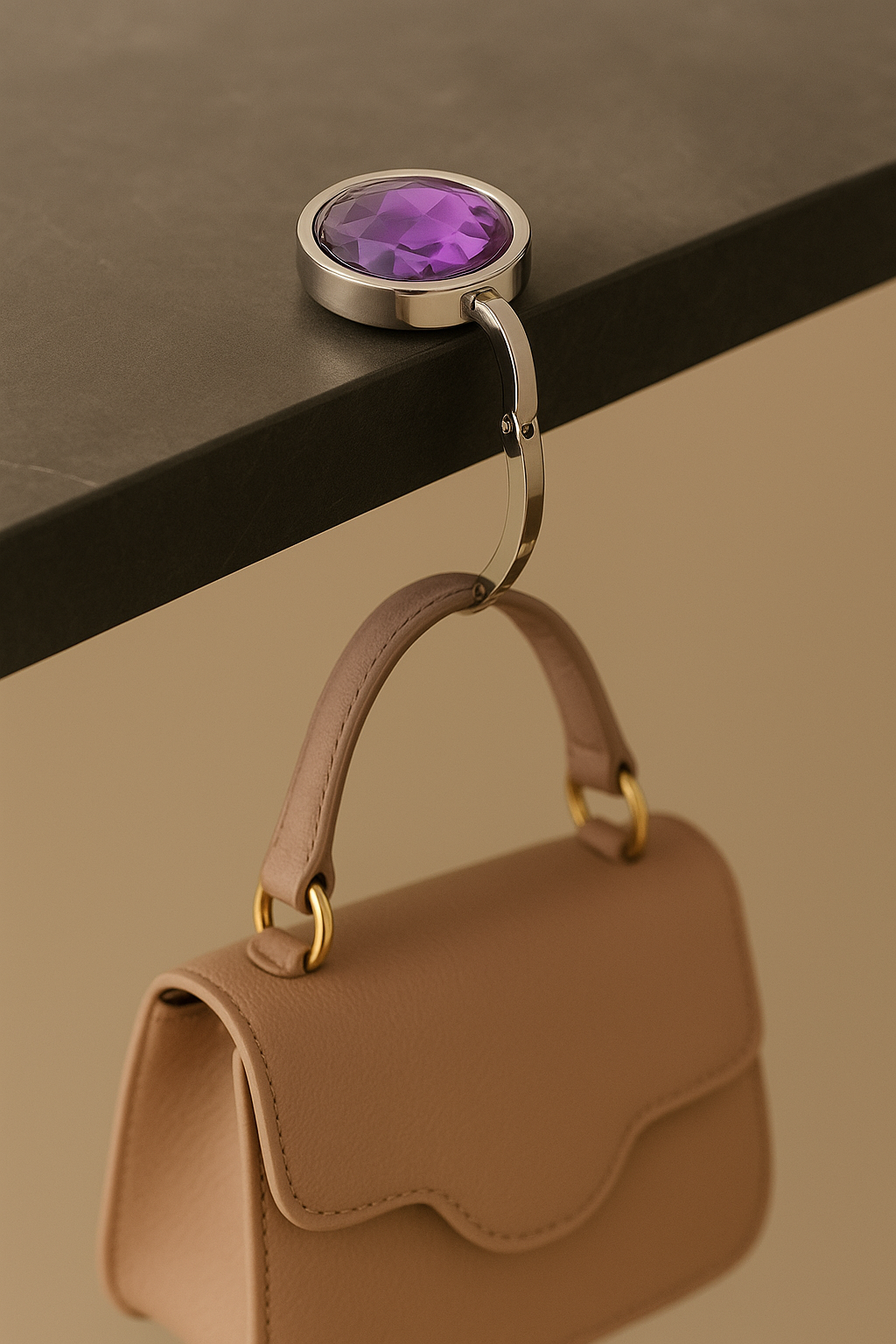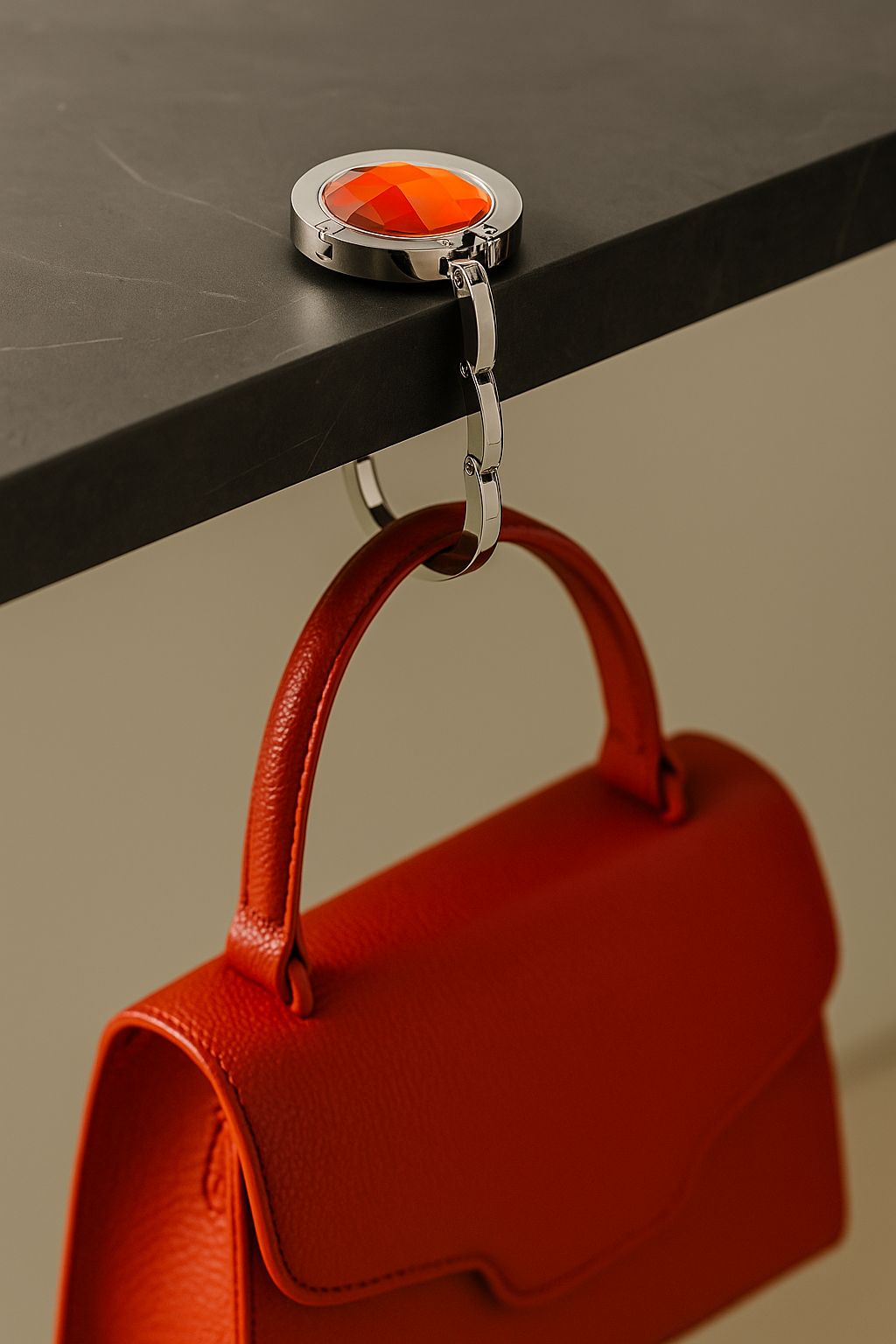 Our foldable handbag hook is compact yet strong, designed to secure your bag on any table edge. The non-slip base guarantees stability, while the rhinestone detail elevates it into more than a tool — it’s a statement.